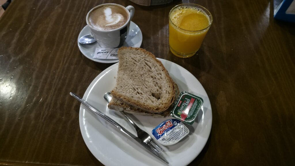 Mhm, es waren doch mehr als 15 km. In der nächsten Bar habe ich gefrühstückt. Und da kamen plötzlich Pilger mit Regensachen rein. Hatte es angefangen zu regnen?